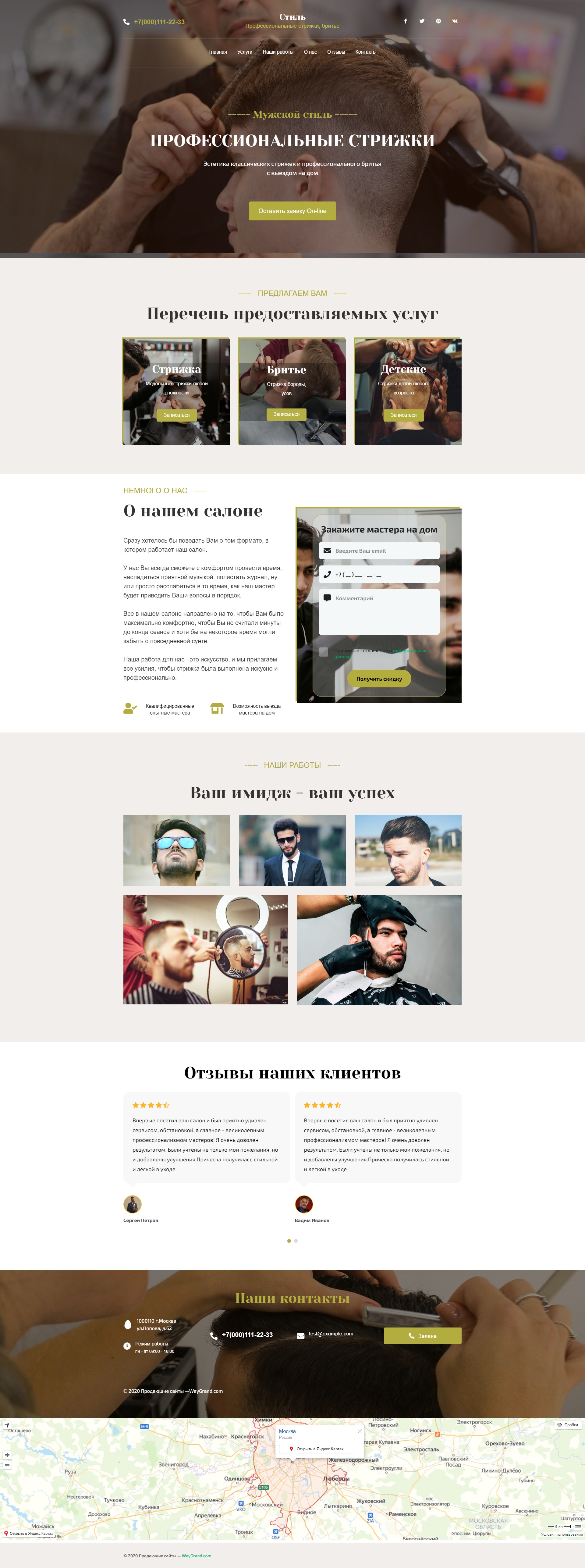 - Блок "О нашем салоне" с формой "Закажите мастера на дом"