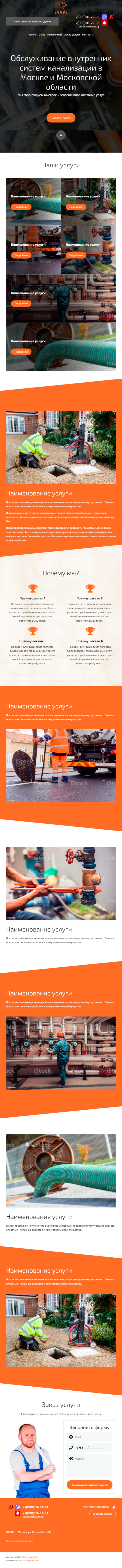 - Промоблок "Обслуживание внутренних систем канализации в Москве и Московской области" с кнопкой призыва к действию "Сделать заказ"